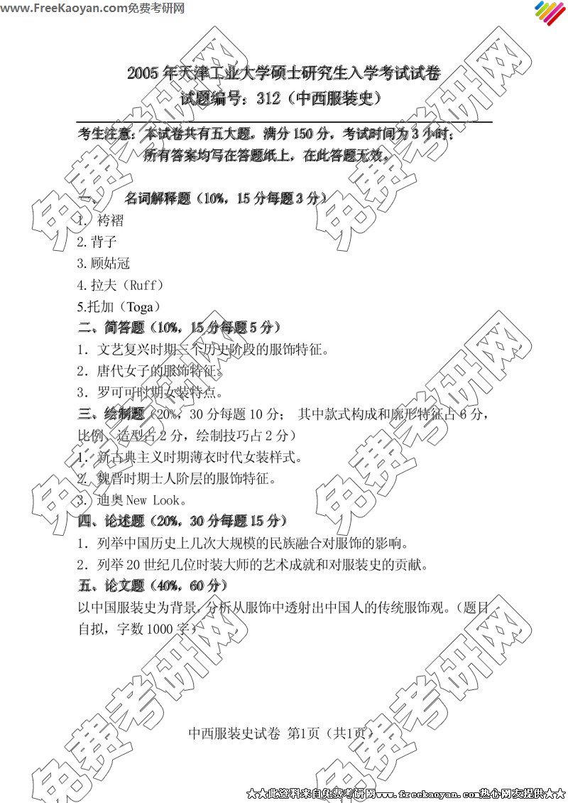 专业课考研经验 本站小编 FreeKaoyan 2018-01-23天津工业大学2005年考研真题-中外美术史