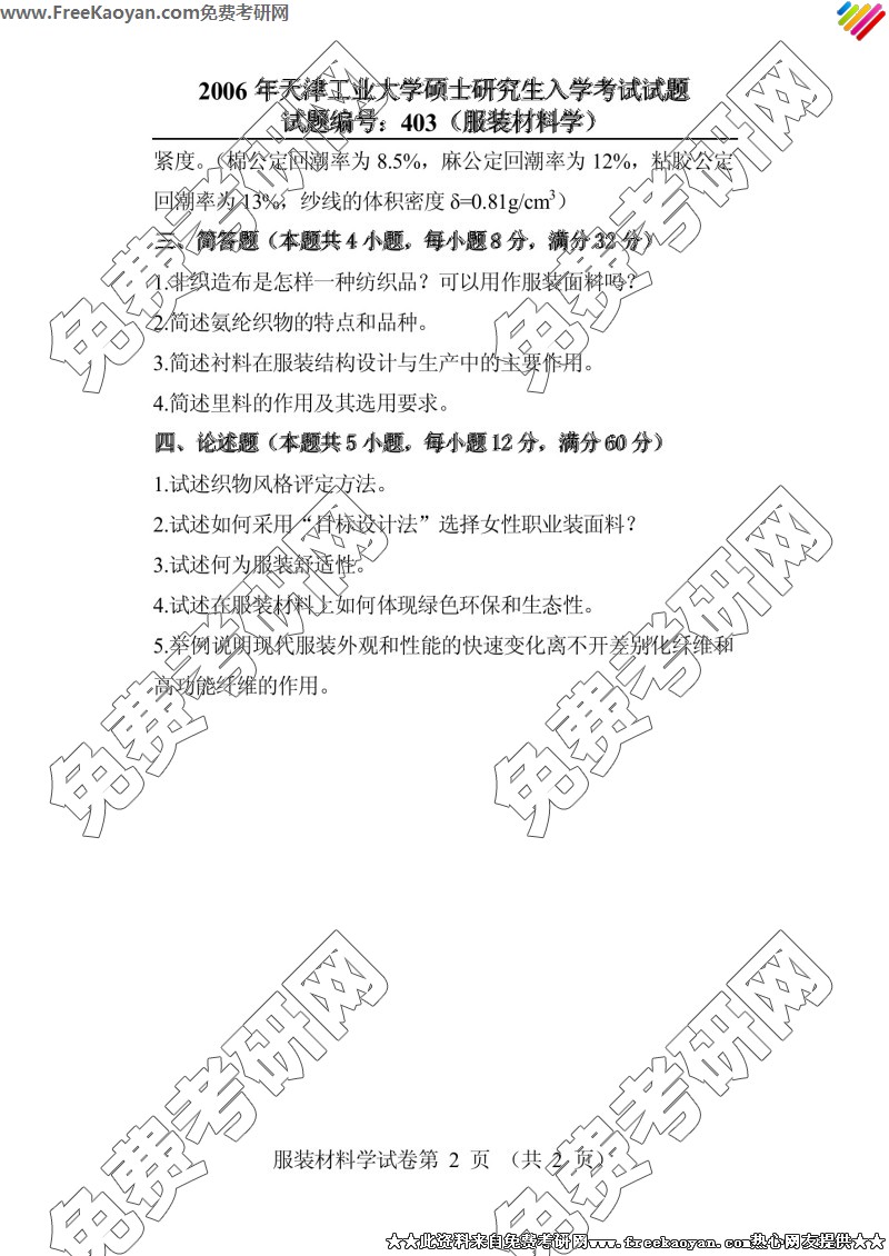 天津工业大学2006年考研真题-服装材料学(403)(2)