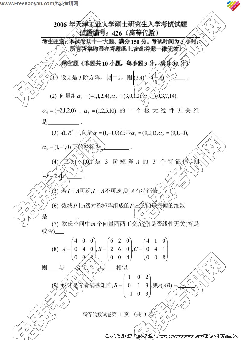天津工业大学2006年考研真题-高等代数(426)