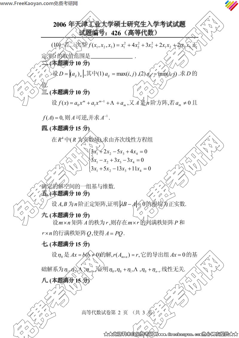 天津工业大学2006年考研真题-高等代数(426)(2)