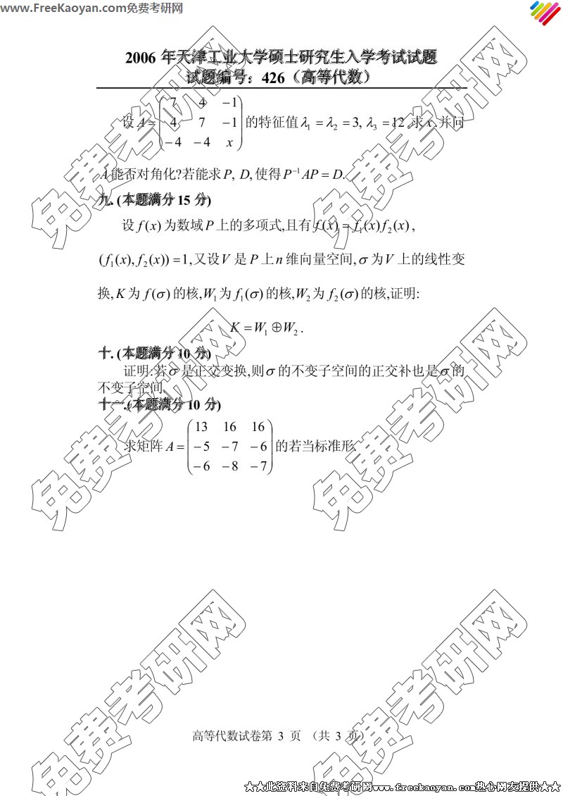 天津工业大学2006年考研真题-高等代数(426)(3)