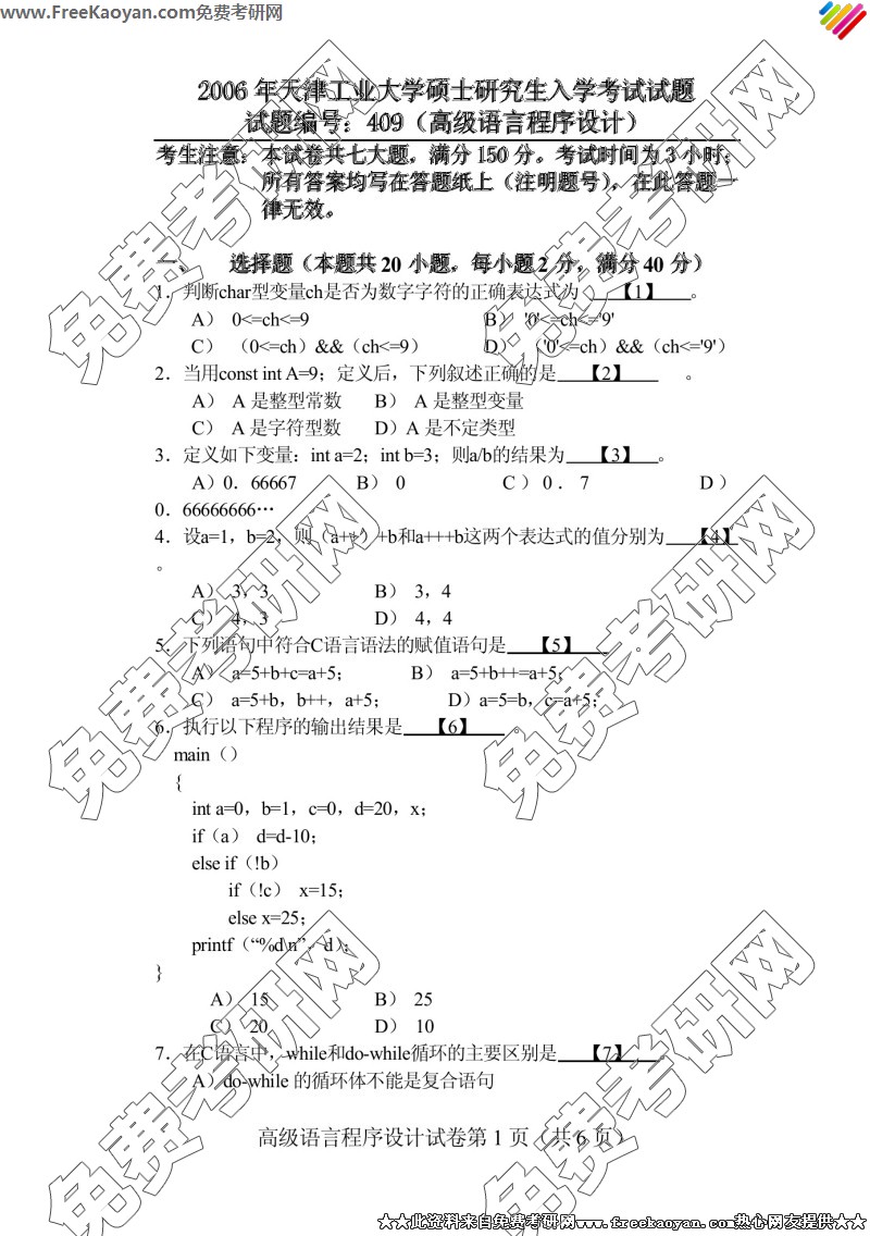 天津工业大学2006年考研真题-高级语言程序设计(409)