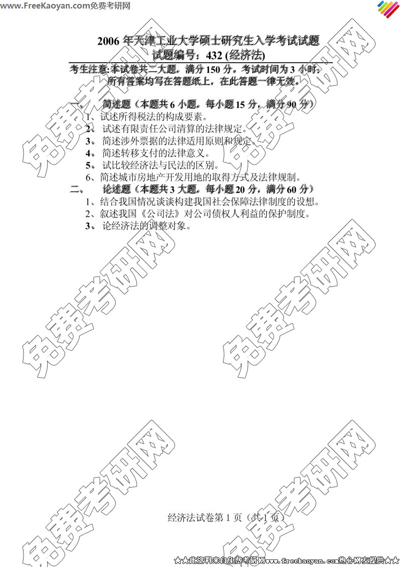 天津工业大学2006年考研真题-经济法(432)