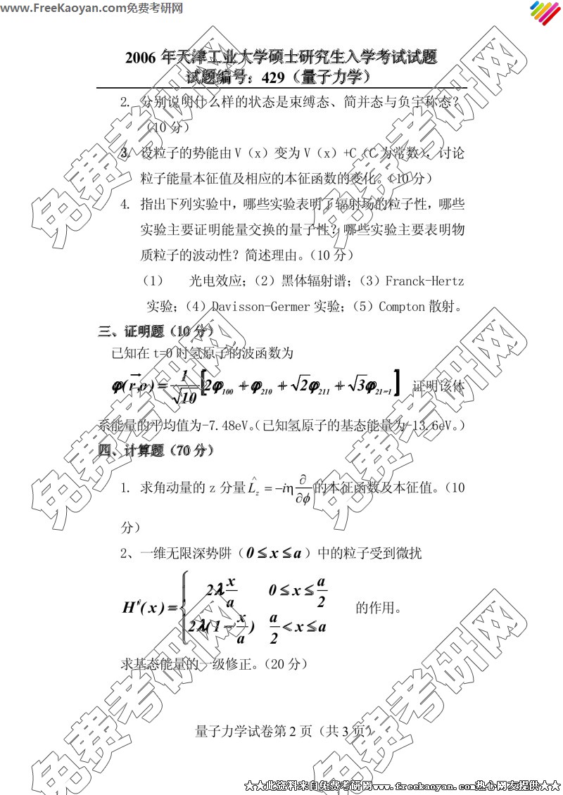 天津工业大学2006年考研真题-量子力学(426)(2)