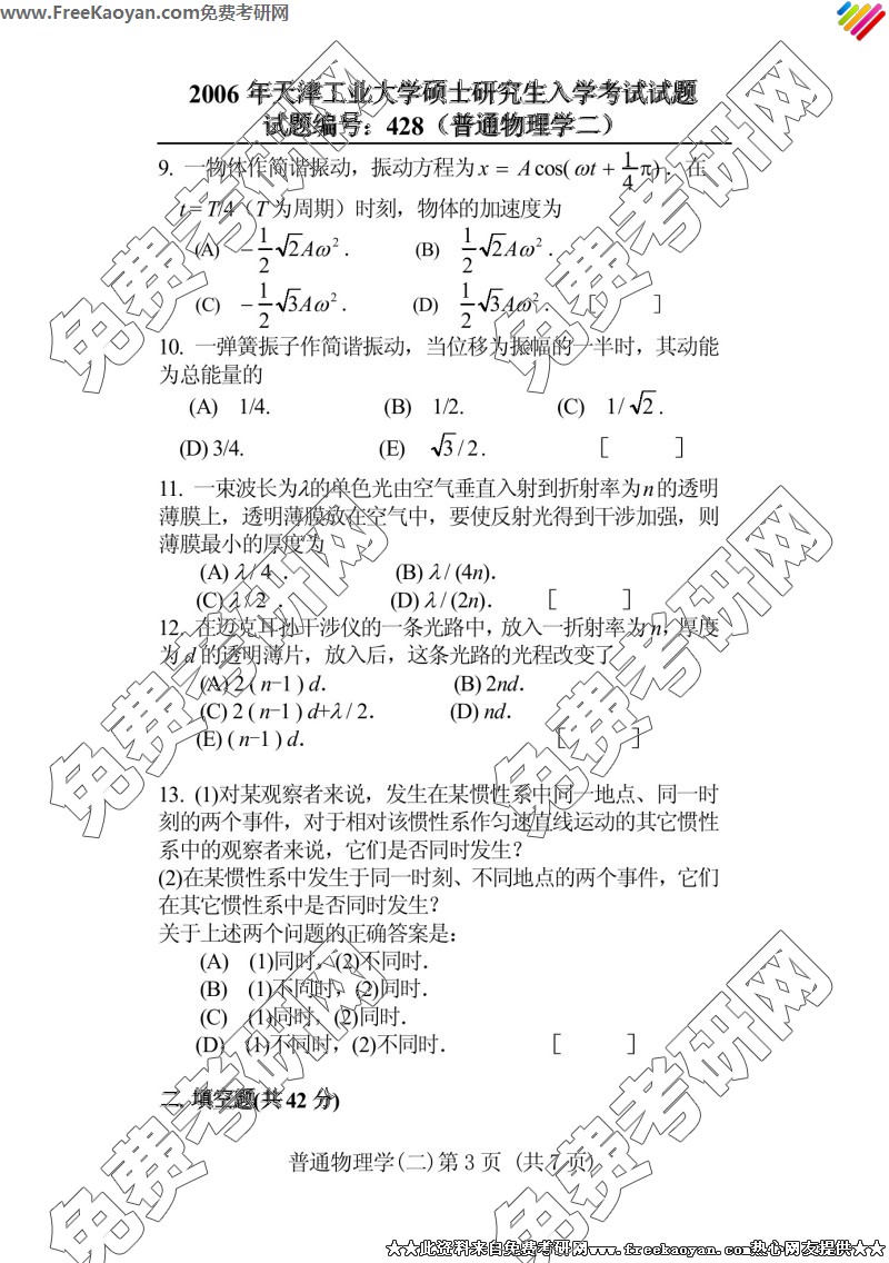 专业课考研经验 本站小编 FreeKaoyan 2018-01-23天津工业大学2006年考研真题-基础光学(408)