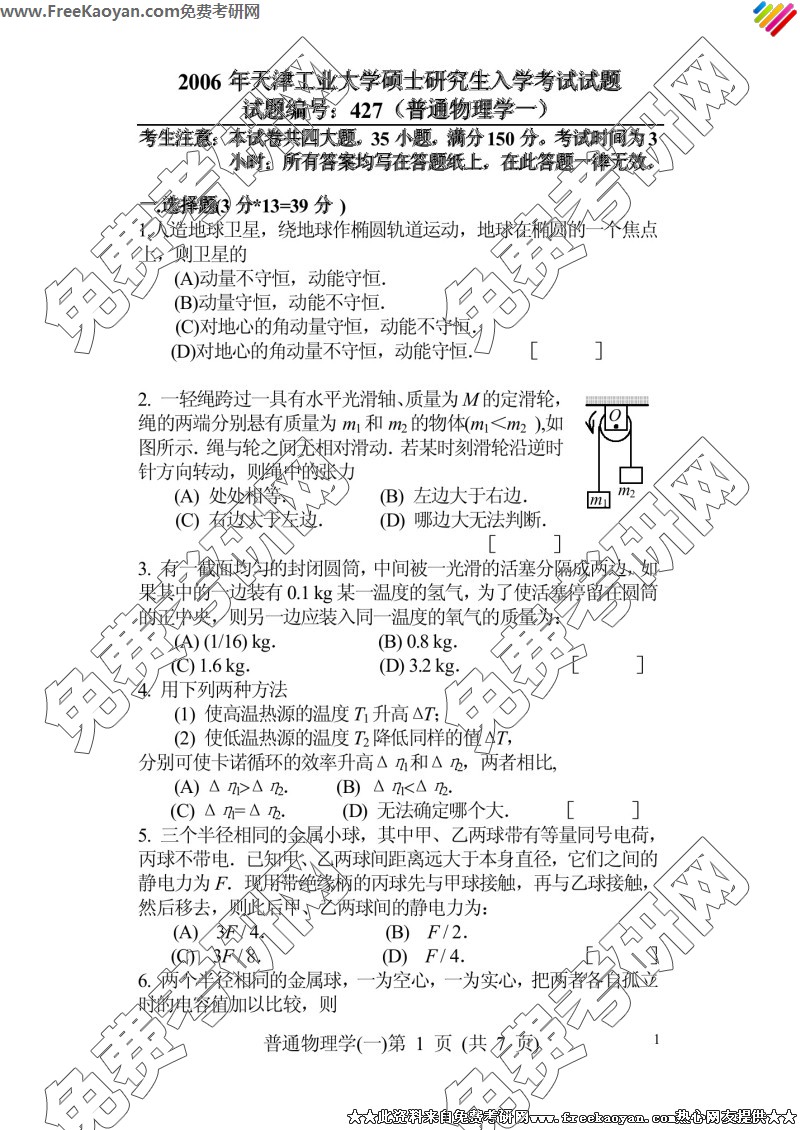 专业课考研经验 本站小编 FreeKaoyan 2018-01-23天津工业大学2006年考研真题-普通物理学二(428)