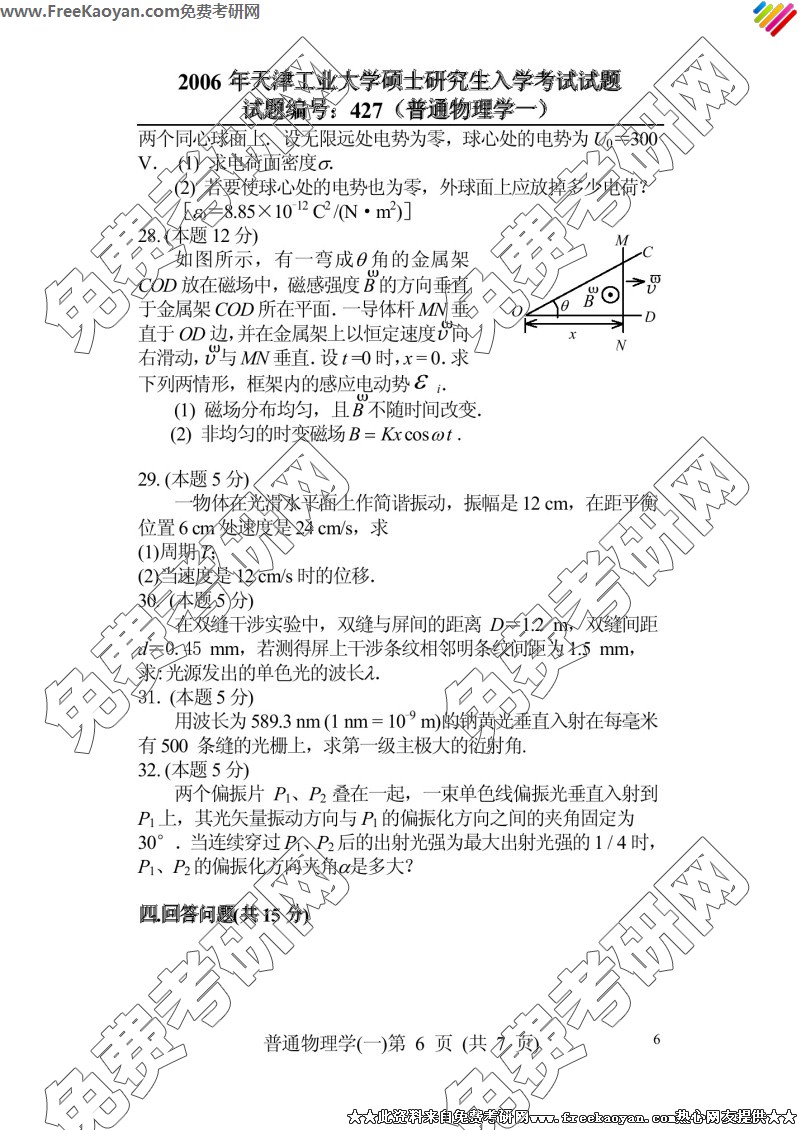 专业课考研经验 本站小编 FreeKaoyan 2018-01-23天津工业大学2006年考研真题-普通物理学二(428)