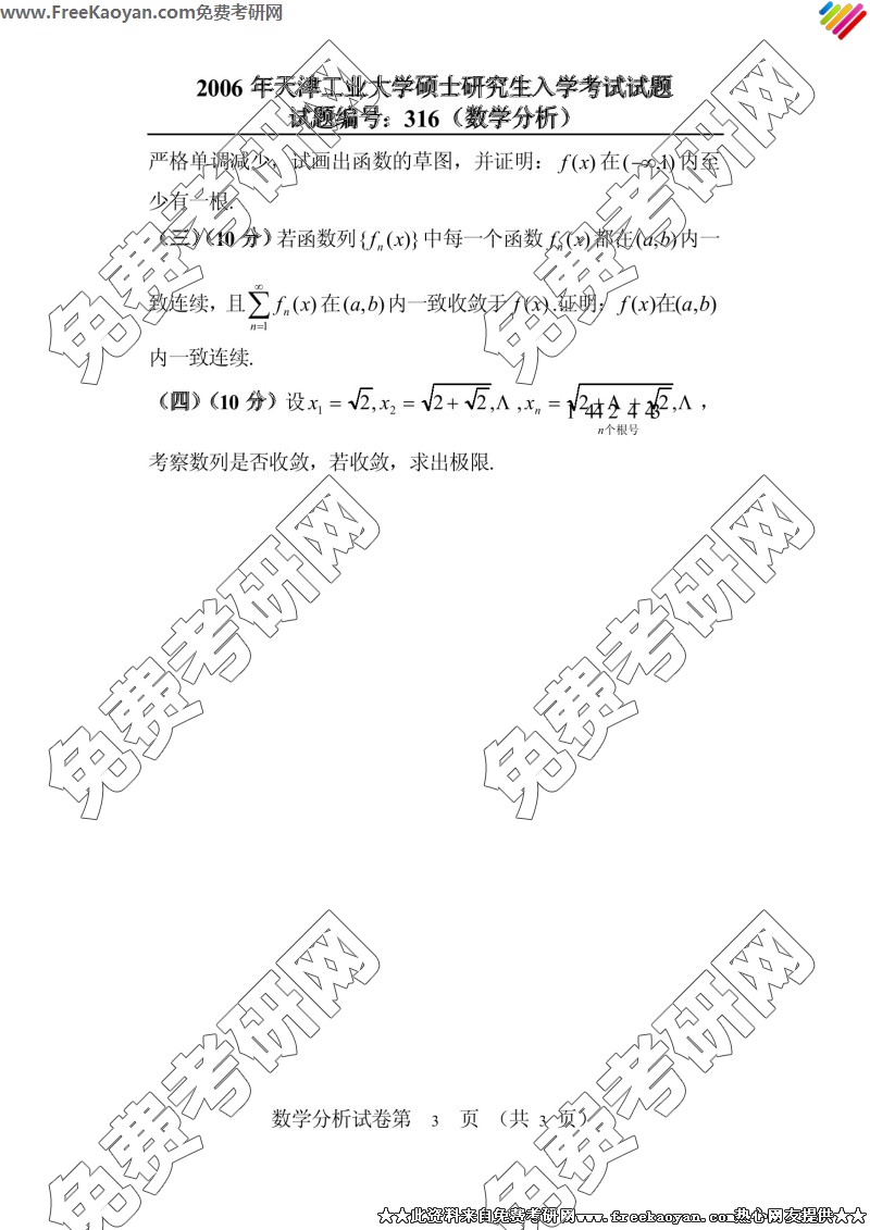 天津工业大学2006年考研真题-数学分析(316)(3)