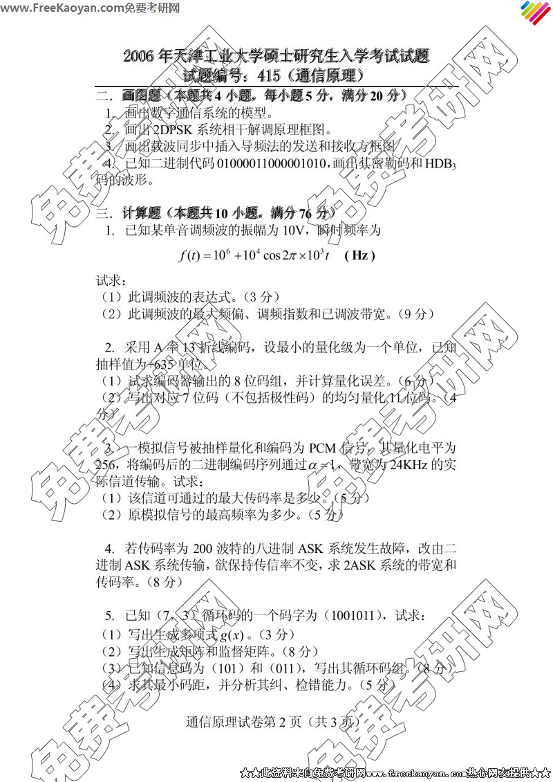 天津工业大学2006年考研真题-通信原理(415)(2)