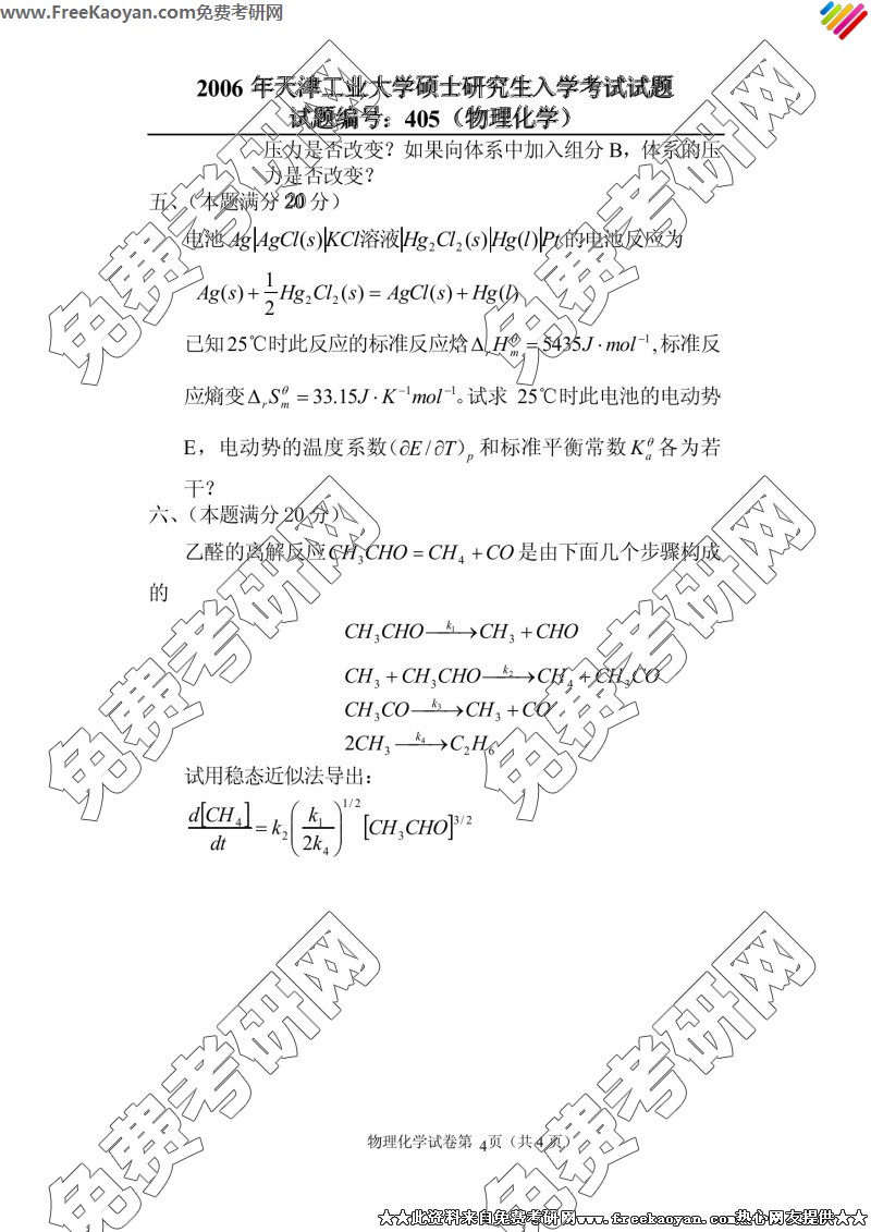天津工业大学2006年考研真题-物理化学(405)(4)