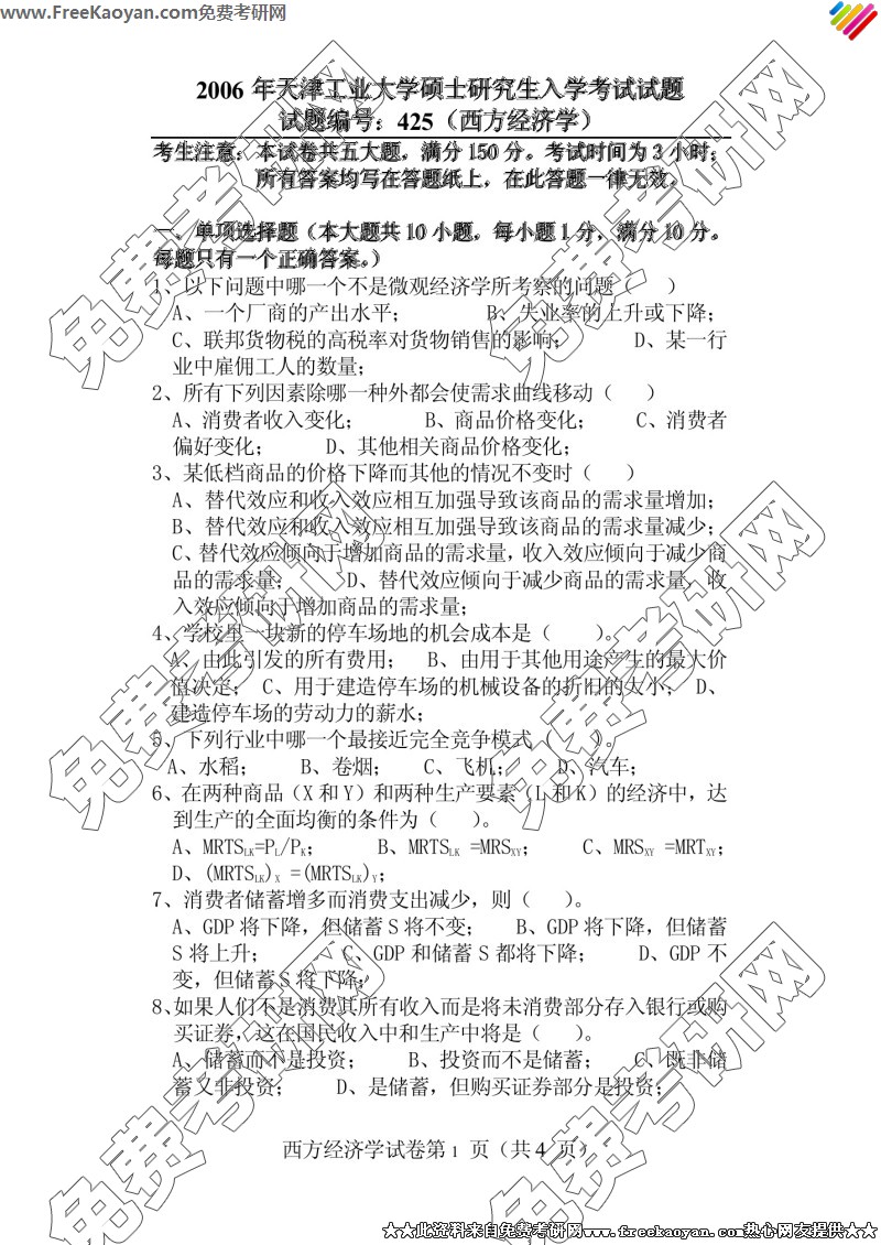 专业课考研经验 本站小编 FreeKaoyan 2018-01-23天津工业大学2006年考研真题-经济法(432)