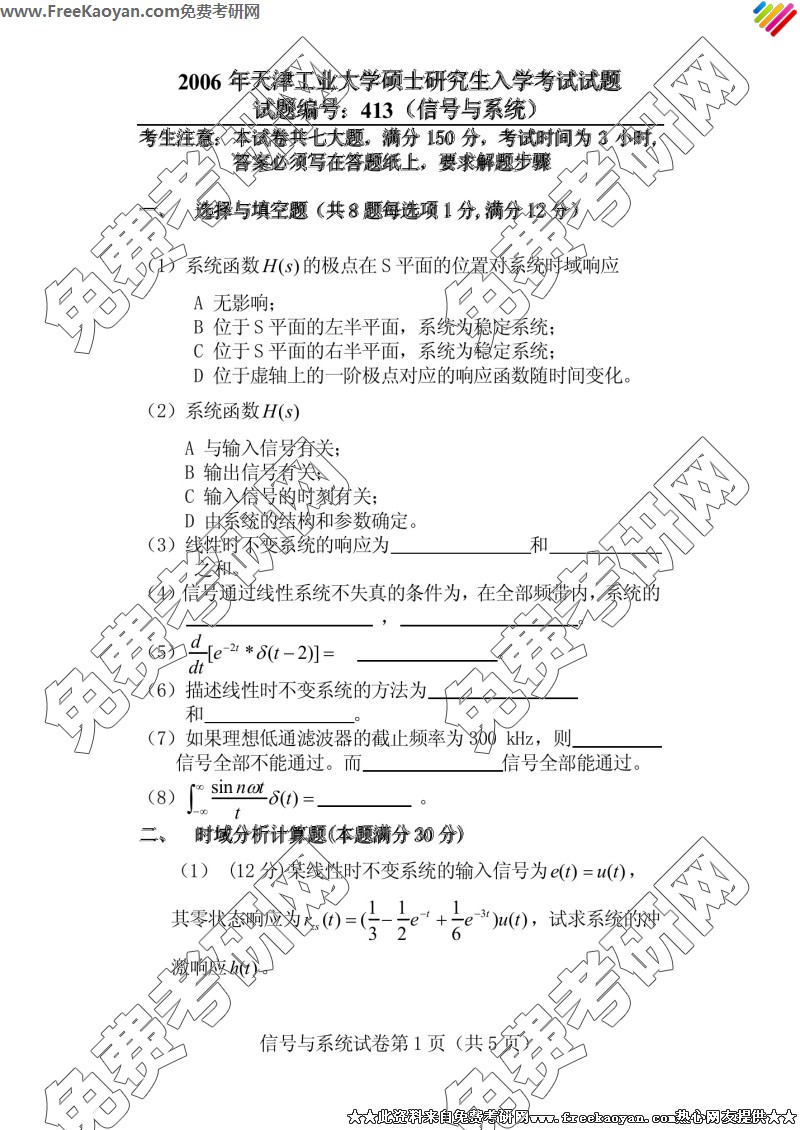 专业课考研经验 本站小编 FreeKaoyan 2018-01-23天津工业大学2006年考研真题-通信原理(415)
