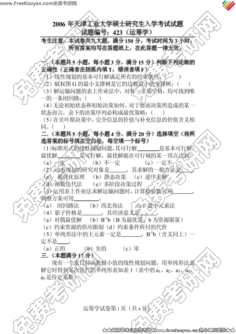 专业课考研经验 本站小编 FreeKaoyan 2018-01-23天津工业大学2006年考研真题-物理化学(405)