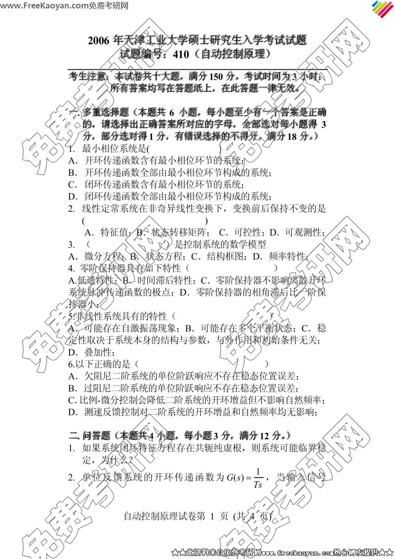 专业课考研经验 本站小编 FreeKaoyan 2018-01-23天津工业大学2006年考研真题-通信原理(415)