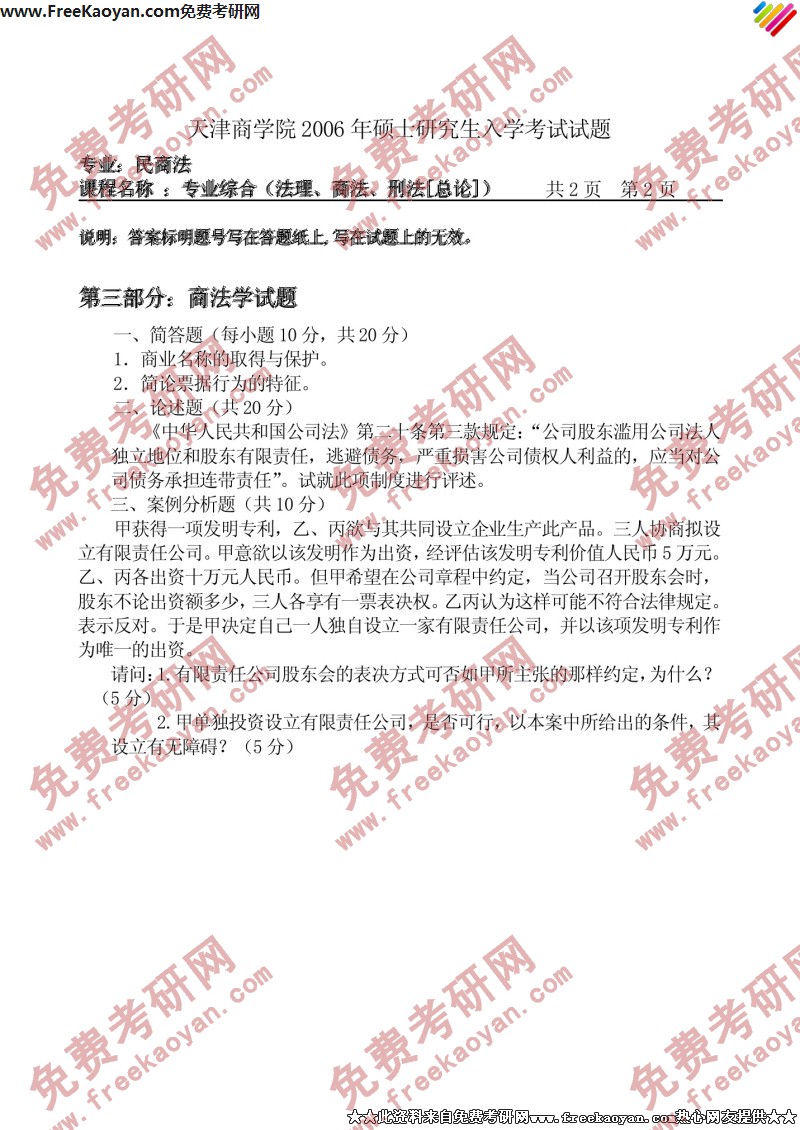 天津商学院2006年考研真题-民商法学(专业综合)(2)