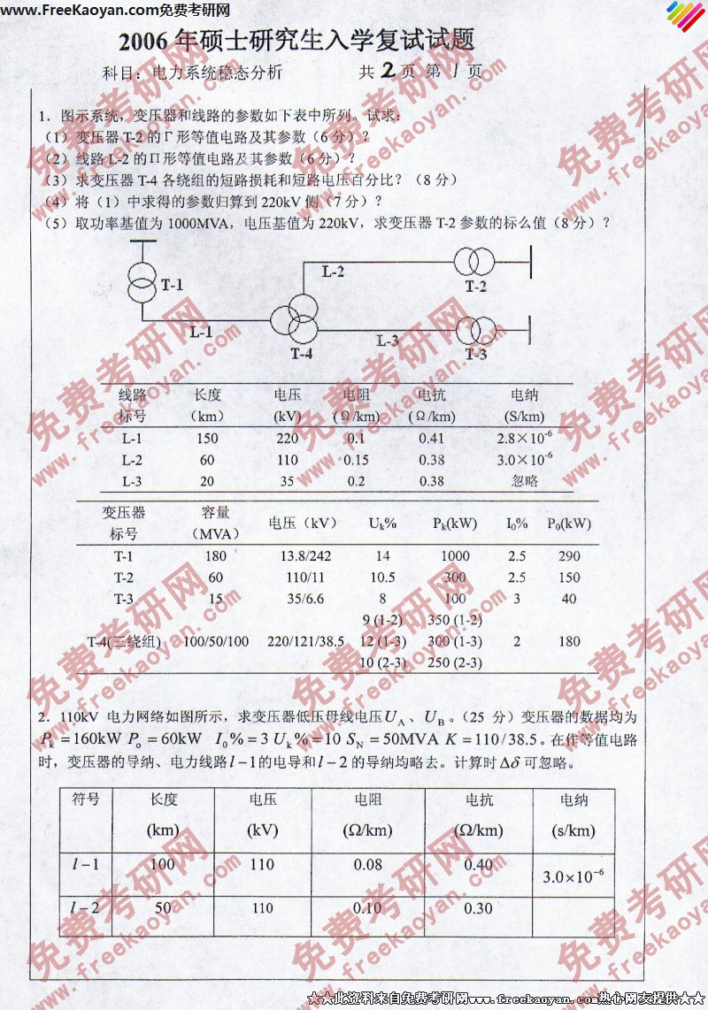 燕山大学2006年考研真题-复试电力系统稳态分析