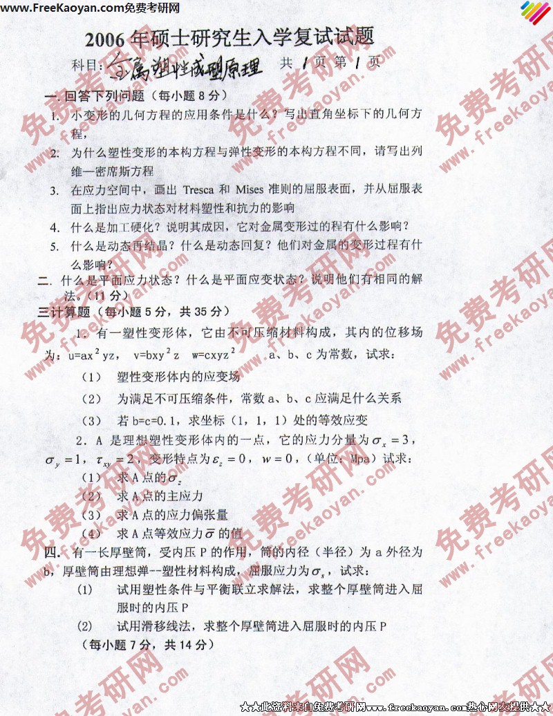 燕山大学2006年考研真题-复试金属塑性成型原理