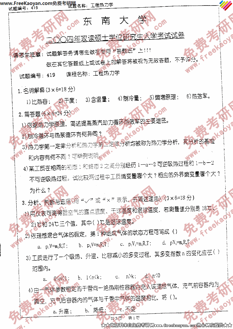 东南大学2004年考研真题-工程热力学