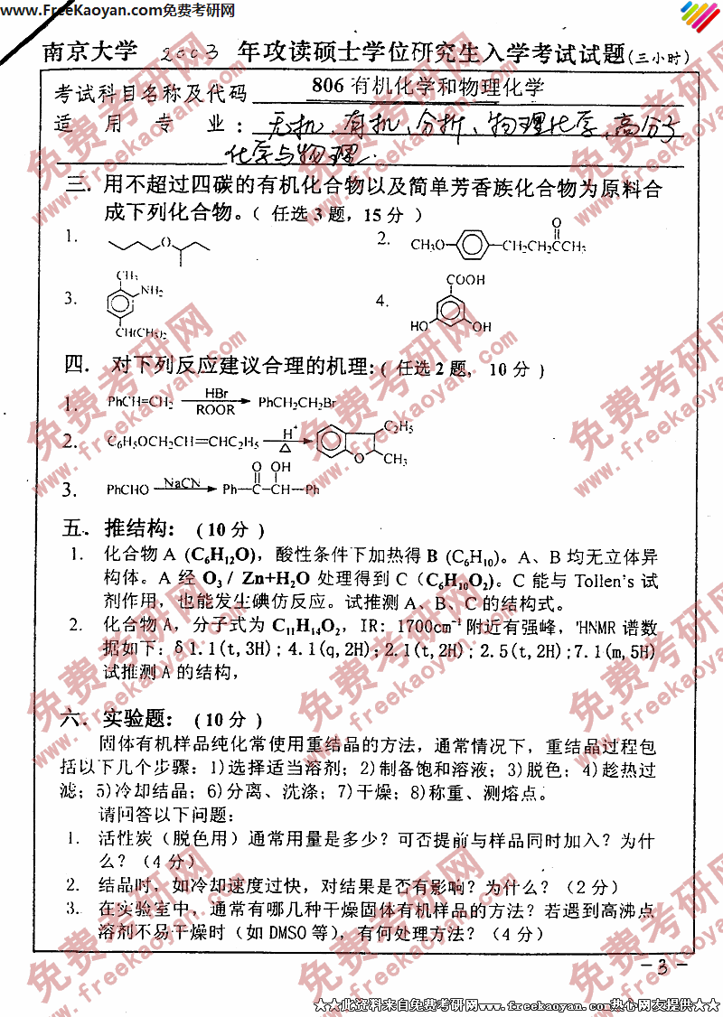南京大学2003年考研真题-有机化学和物理化学(3)