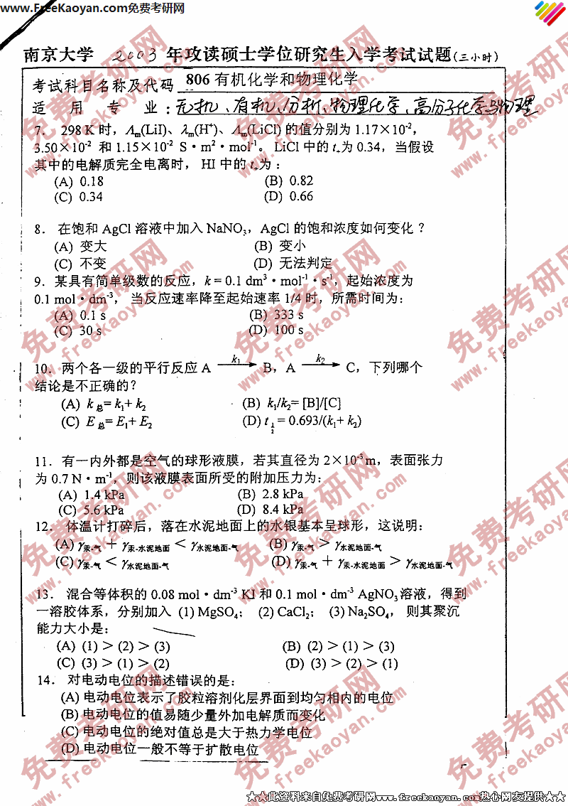 相关话题/考研真题 南京大学 物理化学 有机化学