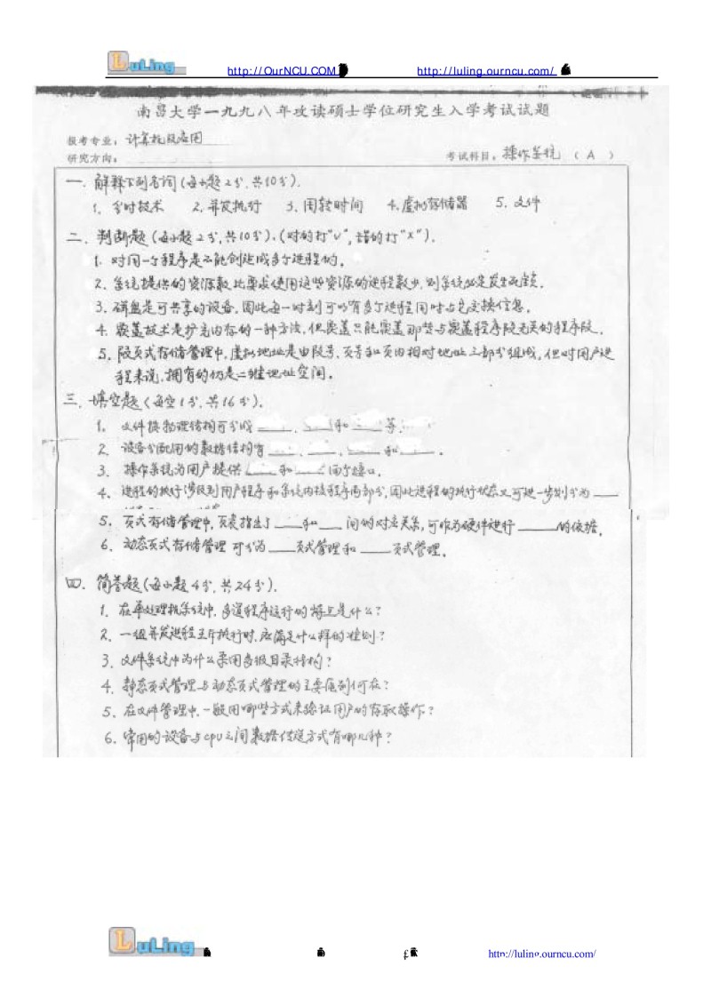南昌大学2002年攻读硕士学位研究生 入 学 考 试 试 题 报考专业:计算机应用 考试科目:操作系统(A)一. 简单解释下列名词或术语 (每小题2分共10分)1. 文件系统2. 与设备无关性3. 虚存4. 原语5. 作业控制方式二. 判断题(共10分,每题1分)1. 设计实时系统首先要考虑的是如何 ...