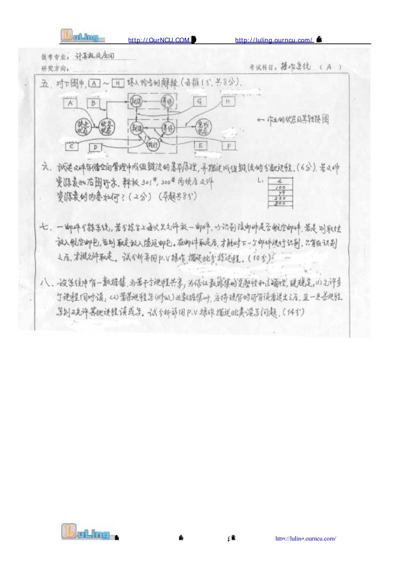 专业课考研经验 本站小编 FreeKaoyan 2018-01-23报考专业:计算机应用 考试科目:数据结构操作系统(A)操作系统部分一.名词解释(每题2分,共10分)1. 分时与分时系统2. 进程控制块3. 系统颠簸(抖动)4. 位示图5. 设备驱动程序一. 简答题(每题4分,共20分)1. 操作系统的基本特征是什么?2. 什么叫联想存储器?设CPU给出有效地址为 ...