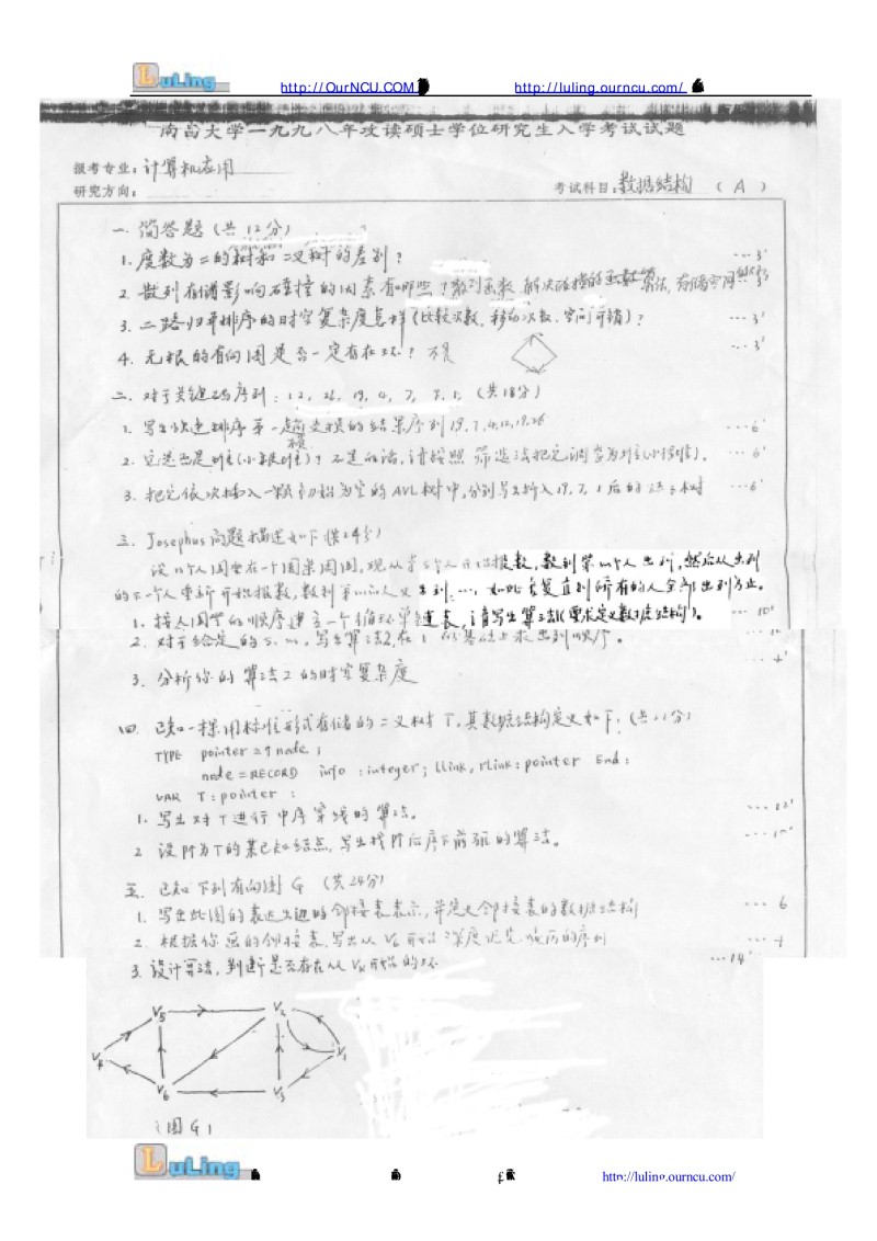 专业课考研经验 本站小编 FreeKaoyan 2018-01-23南昌大学2003年攻读硕士学位研究生 入 学 考 试 试 题报考专业:计算机应用 考试科目:数据结构操作系统(A) 数据结构部分一. 单项选择题.(每题2分,共8分)1.对由n个记录组成的文件排序,如果n较小(n<50)且记录的规模较大,则采用( )排序方法节省时间. A.直接插入 B.直接选择 C ...