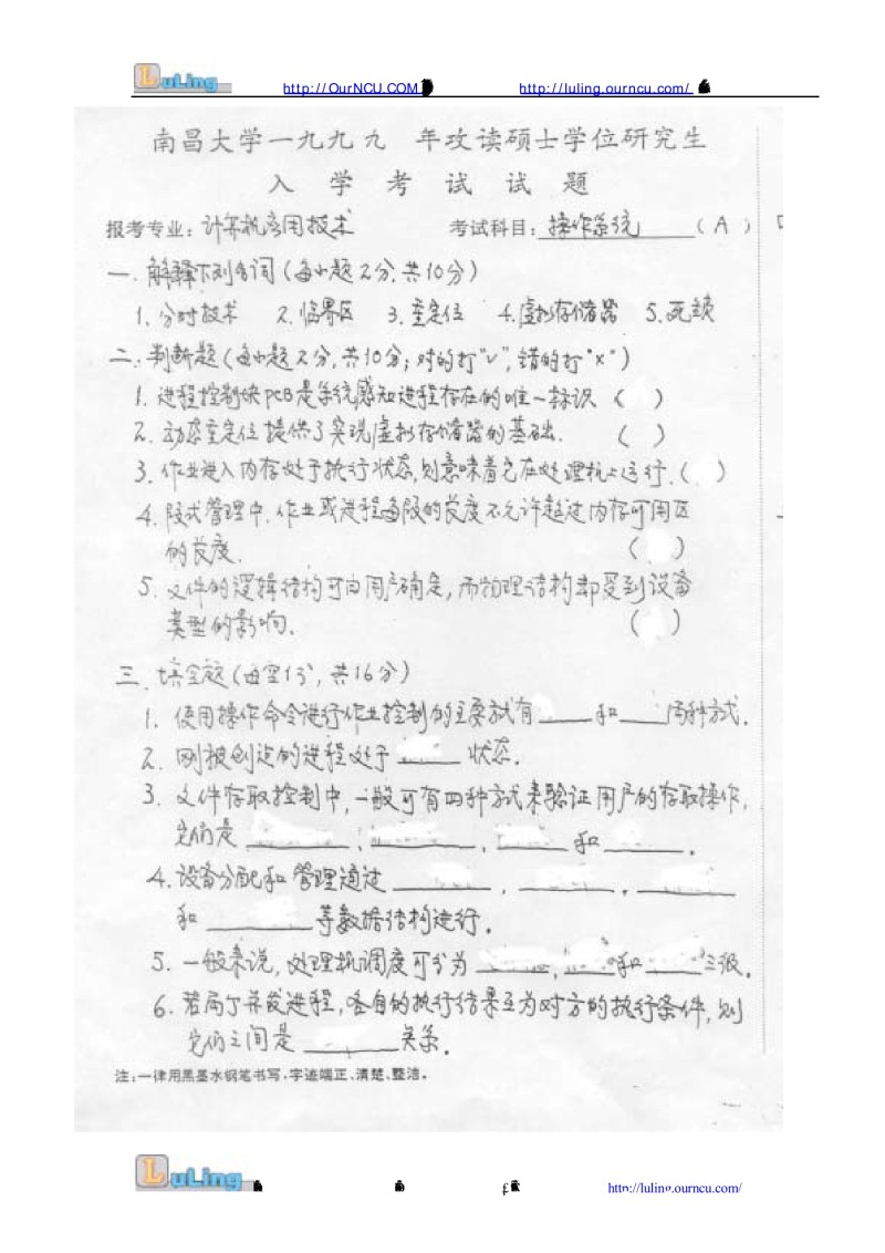 专业课考研经验 本站小编 FreeKaoyan 2018-01-23南昌大学2002年攻读硕士学位研究生 入 学 考 试 试 题 报考专业:计算机应用 考试科目:操作系统(A)一. 简单解释下列名词或术语 (每小题2分共10分)1. 文件系统2. 与设备无关性3. 虚存4. 原语5. 作业控制方式二. 判断题(共10分,每题1分)1. 设计实时系统首先要考虑的是如何 ...