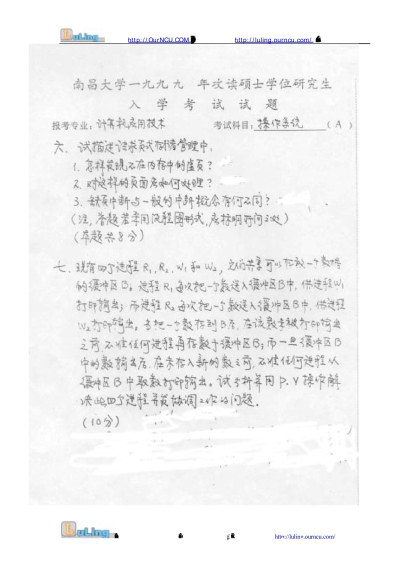 南昌大学2002年攻读硕士学位研究生 入 学 考 试 试 题 报考专业:计算机应用 考试科目:操作系统(A)一. 简单解释下列名词或术语 (每小题2分共10分)1. 文件系统2. 与设备无关性3. 虚存4. 原语5. 作业控制方式二. 判断题(共10分,每题1分)1. 设计实时系统首先要考虑的是如何 ...