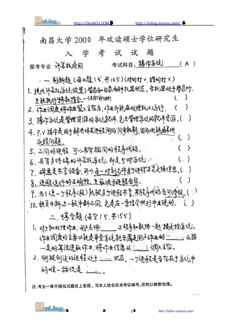 专业课考研经验 本站小编 FreeKaoyan 2018-01-23报考专业:计算机应用 考试科目:数据结构操作系统(A)操作系统部分一.名词解释(每题2分,共10分)1. 分时与分时系统2. 进程控制块3. 系统颠簸(抖动)4. 位示图5. 设备驱动程序一. 简答题(每题4分,共20分)1. 操作系统的基本特征是什么?2. 什么叫联想存储器?设CPU给出有效地址为 ...