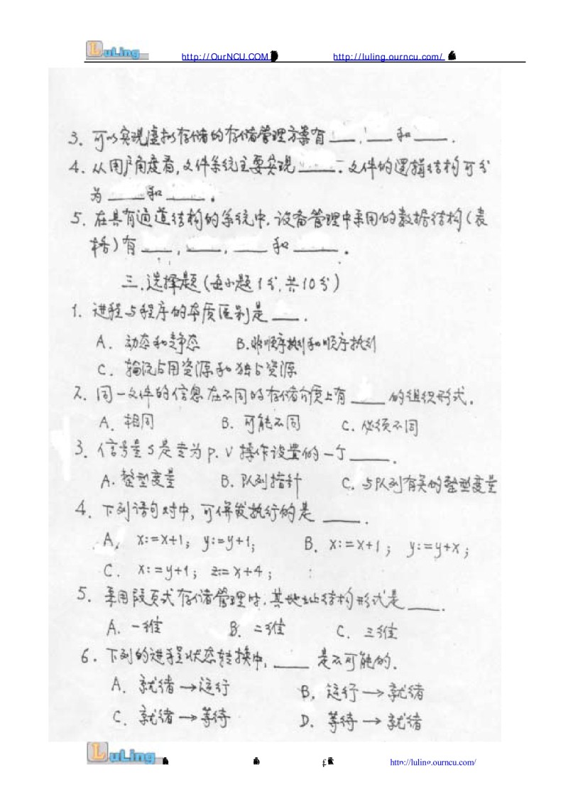 报考专业:计算机应用 考试科目:数据结构操作系统(A)操作系统部分一.名词解释(每题2分,共10分)1. 分时与分时系统2. 进程控制块3. 系统颠簸(抖动)4. 位示图5. 设备驱动程序一. 简答题(每题4分,共20分)1. 操作系统的基本特征是什么?2. 什么叫联想存储器?设CPU给出有效地址为 ...