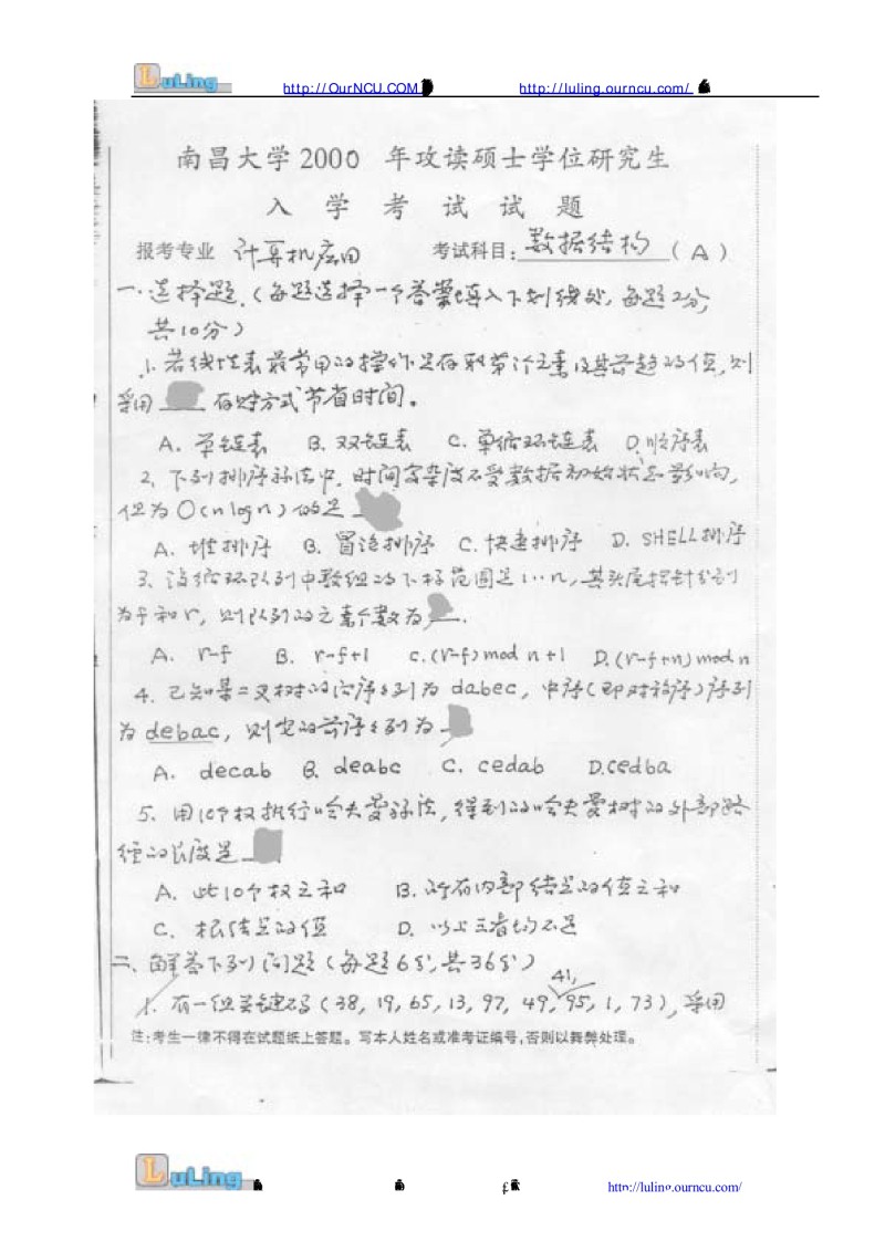 专业课考研经验 本站小编 FreeKaoyan 2018-01-23南昌大学2003年攻读硕士学位研究生 入 学 考 试 试 题报考专业:计算机应用 考试科目:数据结构操作系统(A) 数据结构部分一. 单项选择题.(每题2分,共8分)1.对由n个记录组成的文件排序,如果n较小(n<50)且记录的规模较大,则采用( )排序方法节省时间. A.直接插入 B.直接选择 C ...