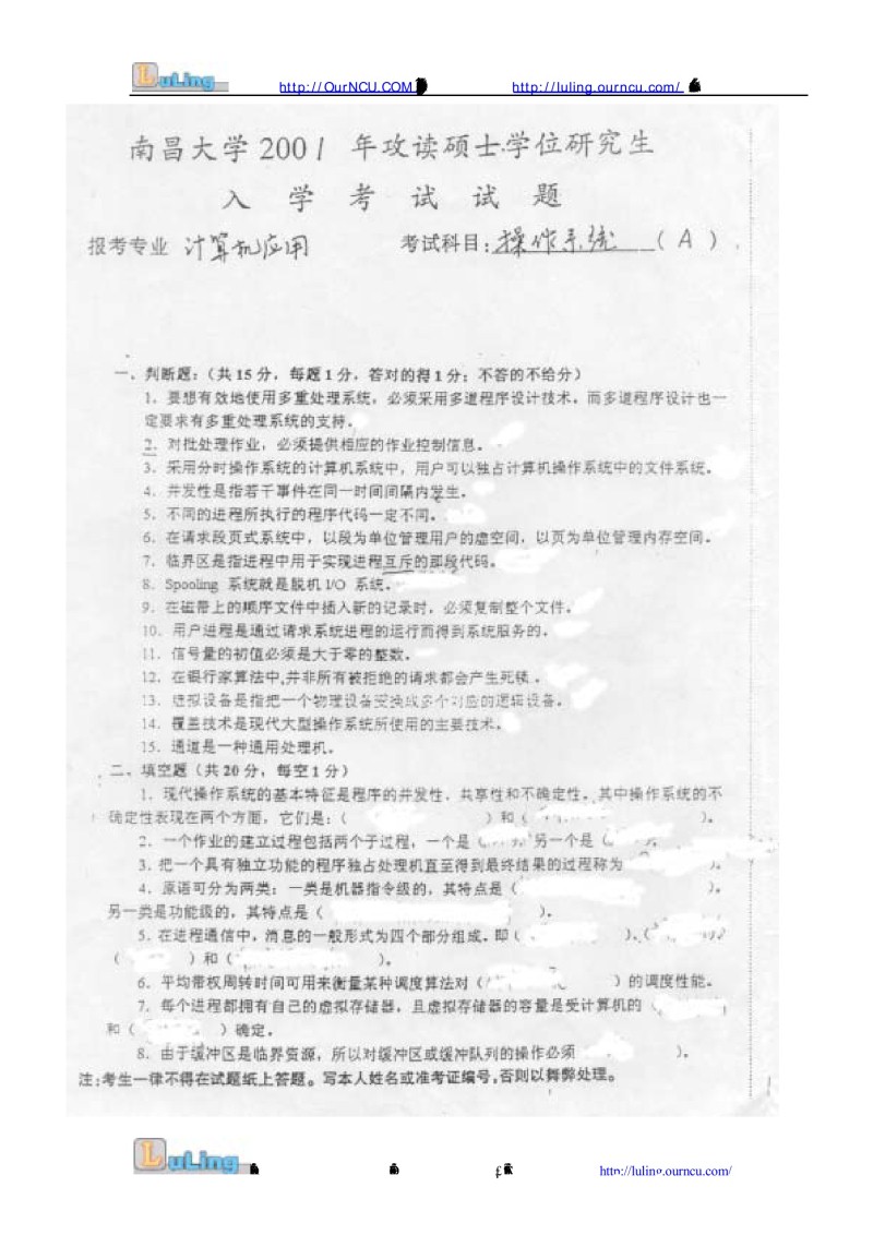 专业课考研经验 本站小编 FreeKaoyan 2018-01-23报考专业:计算机应用 考试科目:数据结构操作系统(A)操作系统部分一.名词解释(每题2分,共10分)1. 分时与分时系统2. 进程控制块3. 系统颠簸(抖动)4. 位示图5. 设备驱动程序一. 简答题(每题4分,共20分)1. 操作系统的基本特征是什么?2. 什么叫联想存储器?设CPU给出有效地址为 ...
