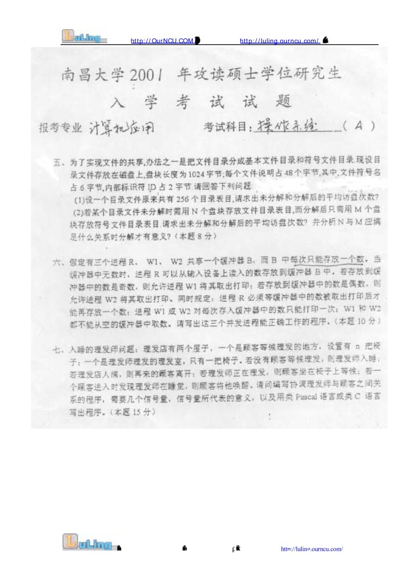 专业课考研经验 本站小编 FreeKaoyan 2018-01-23报考专业:计算机应用 考试科目:数据结构操作系统(A)操作系统部分一.名词解释(每题2分,共10分)1. 分时与分时系统2. 进程控制块3. 系统颠簸(抖动)4. 位示图5. 设备驱动程序一. 简答题(每题4分,共20分)1. 操作系统的基本特征是什么?2. 什么叫联想存储器?设CPU给出有效地址为 ...