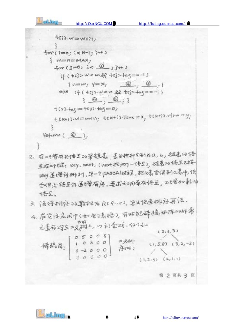 专业课考研经验 本站小编 FreeKaoyan 2018-01-23南昌大学2003年攻读硕士学位研究生 入 学 考 试 试 题报考专业:计算机应用 考试科目:数据结构操作系统(A) 数据结构部分一. 单项选择题.(每题2分,共8分)1.对由n个记录组成的文件排序,如果n较小(n<50)且记录的规模较大,则采用( )排序方法节省时间. A.直接插入 B.直接选择 C ...