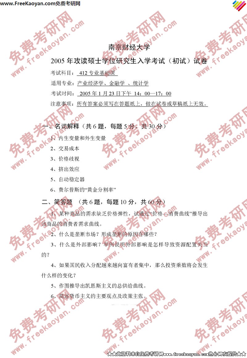 南京财经大学2005年攻读硕士学位研究生入学考试(初试)试卷——产业经济学、金融学 、统计学专业412专业基础课考试科目: 412专业基础课 适用专业:产业经济学、金融学 、统计学考试时间: 2005年1月23日下午 14:00—17:00注意事项:所有答案必须写在答题纸上,做在试卷或草稿纸上无效。 ...