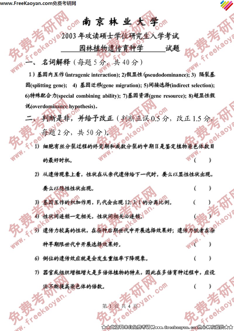 南京林业大学2003年考研真题-园林植物遗传育种学