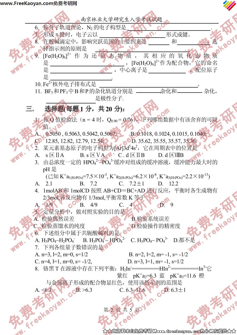 南京林业大学2004年考研真题-无机及分析化学(2)