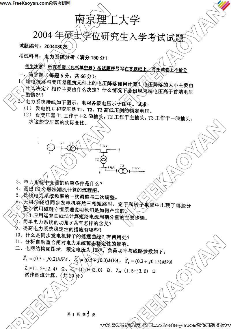 南京理工大学2004年考研真题-电力系统分析