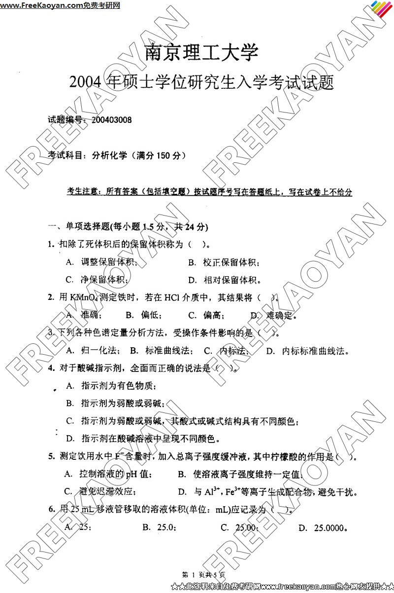南京理工大学2004年考研真题-分析化学