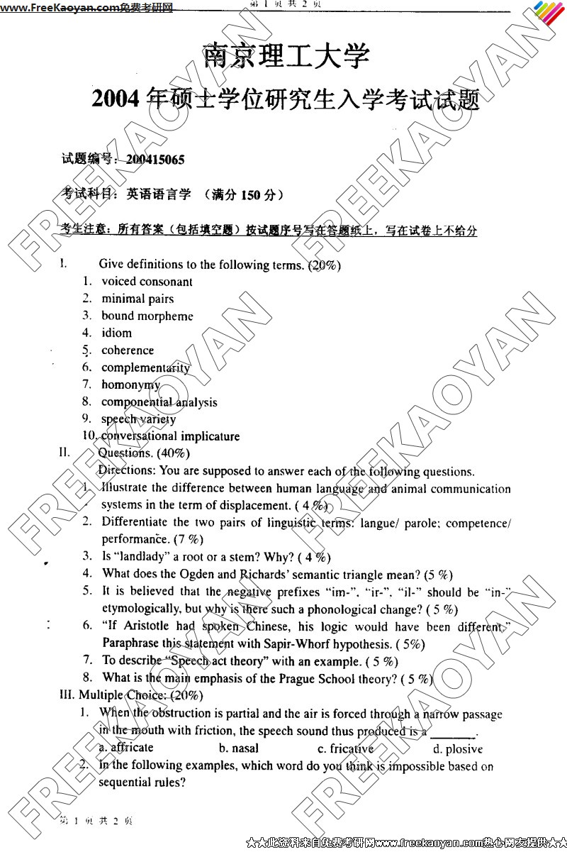 专业课考研经验 本站小编 FreeKaoyan 2018-01-23南京理工大学2004年考研真题-日语(二外)
