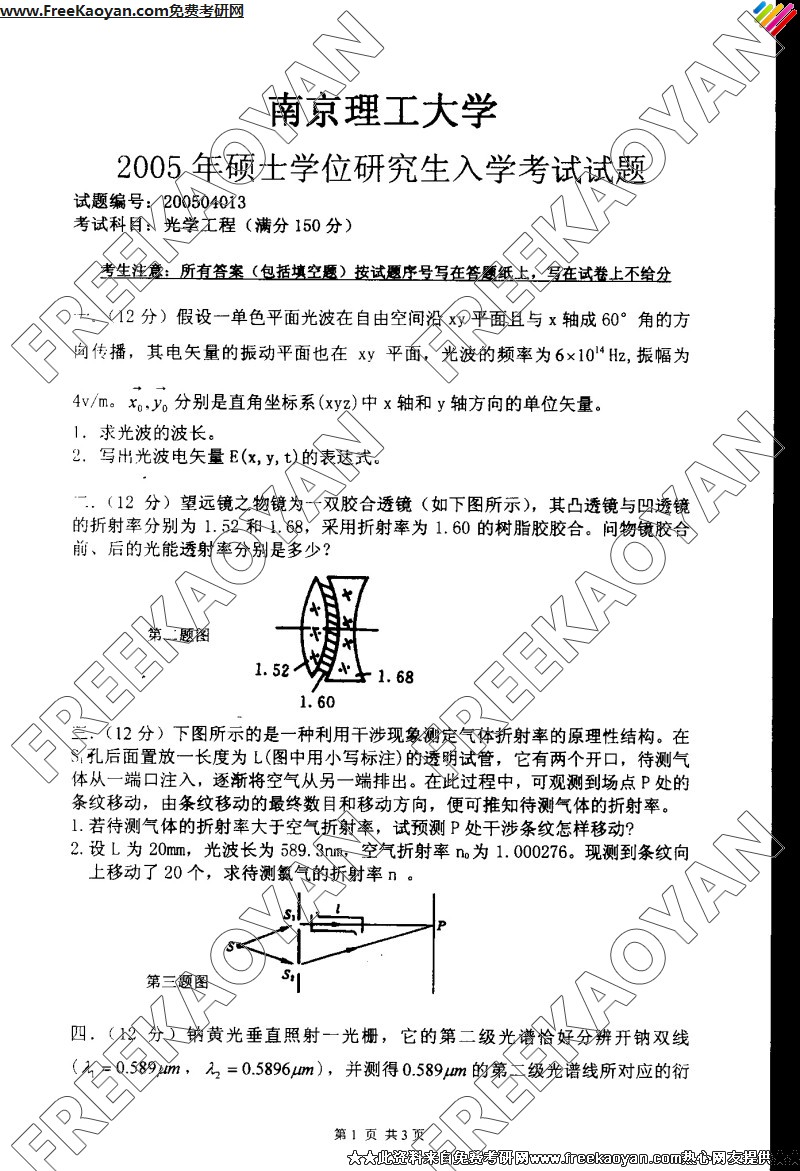 南京理工大学2005年考研真题-光学工程