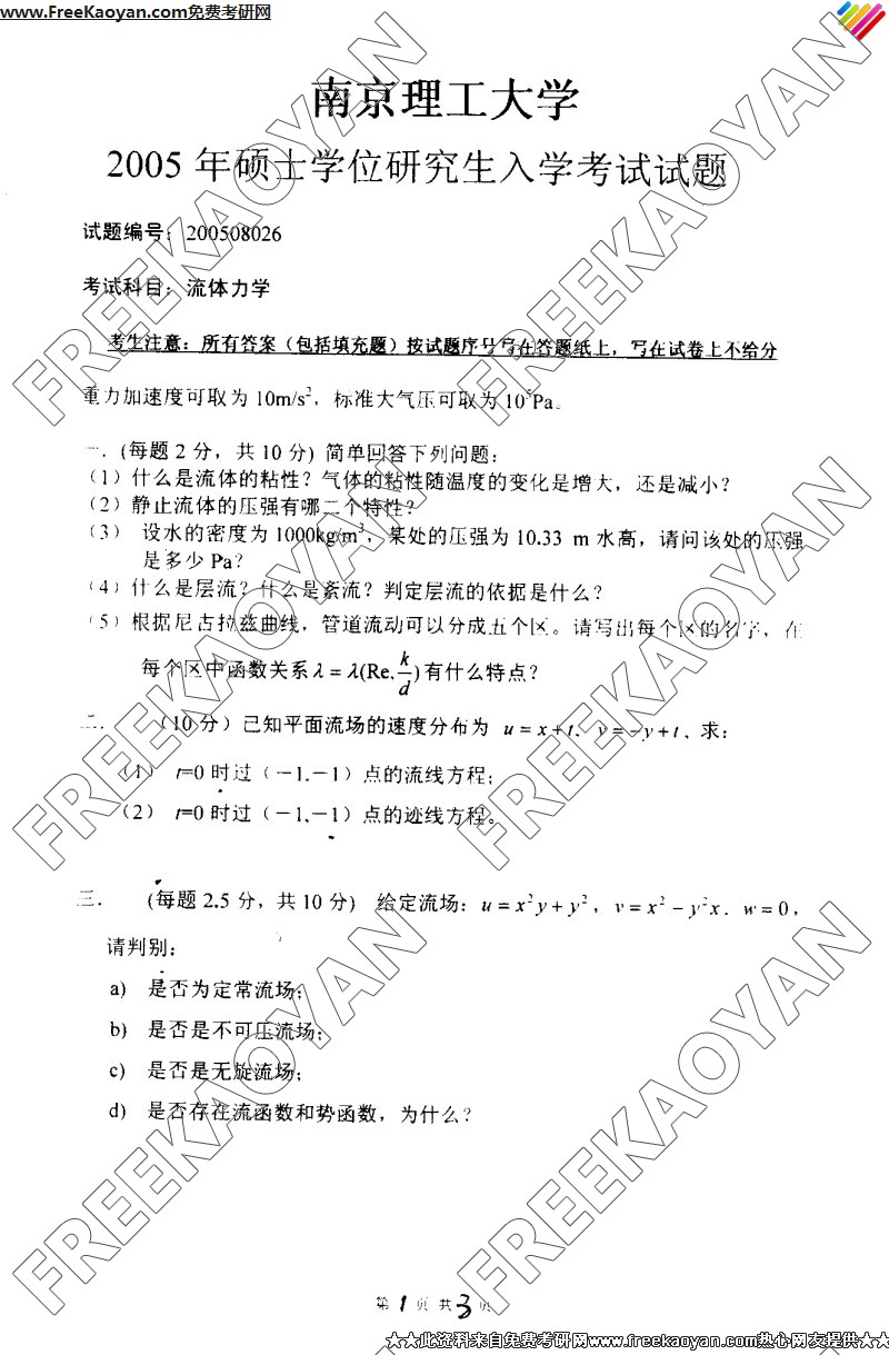 相关话题/南京理工大学 考研真题 流体力学