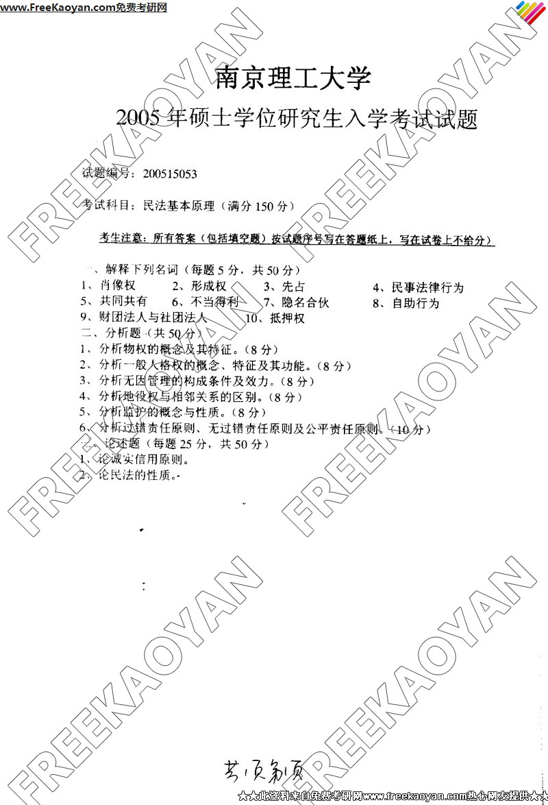 南京理工大学2005年考研真题-民法基本原理