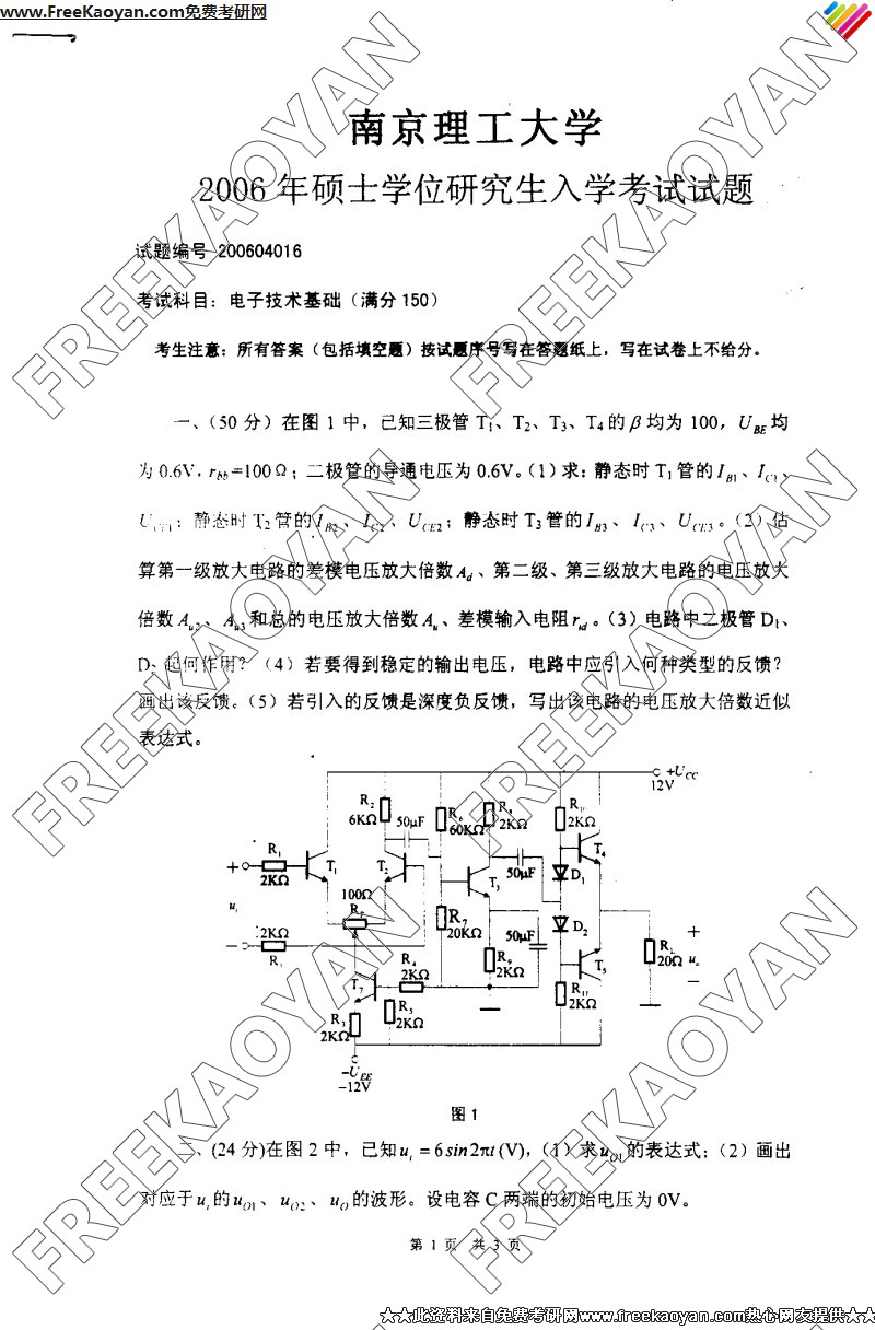 专业课考研经验 本站小编 FreeKaoyan 2018-01-23南京理工大学2006年考研真题-电子技术