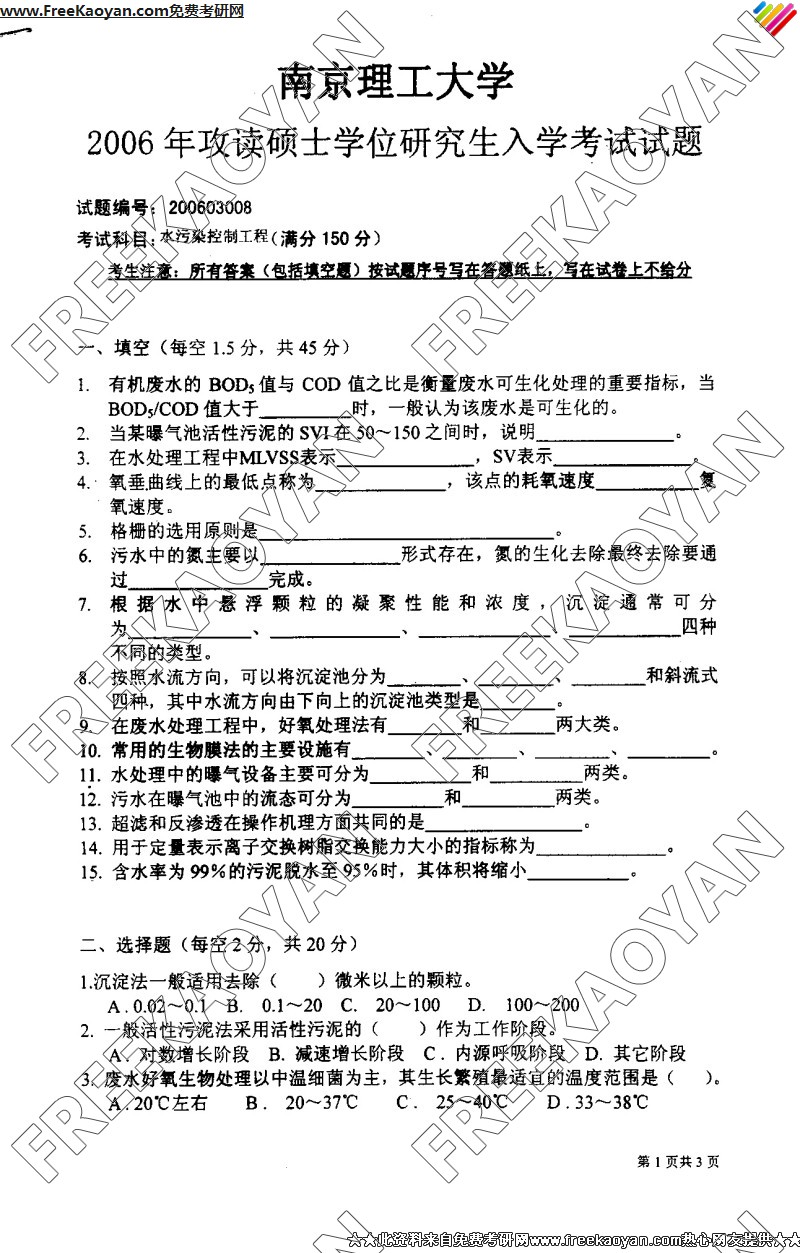 南京理工大学2006年考研真题-水污染控制工程