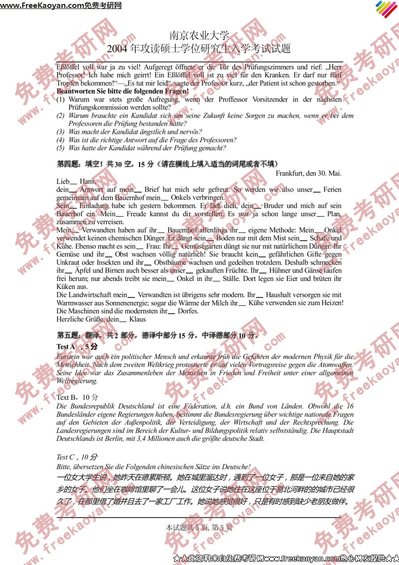 南京农业大学2004年考研真题-德语二外(5)