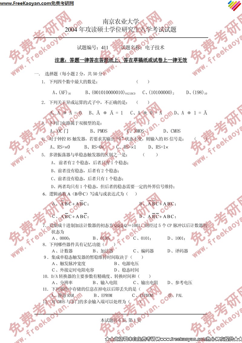 相关话题/南京农业大学 考研真题 电子技术