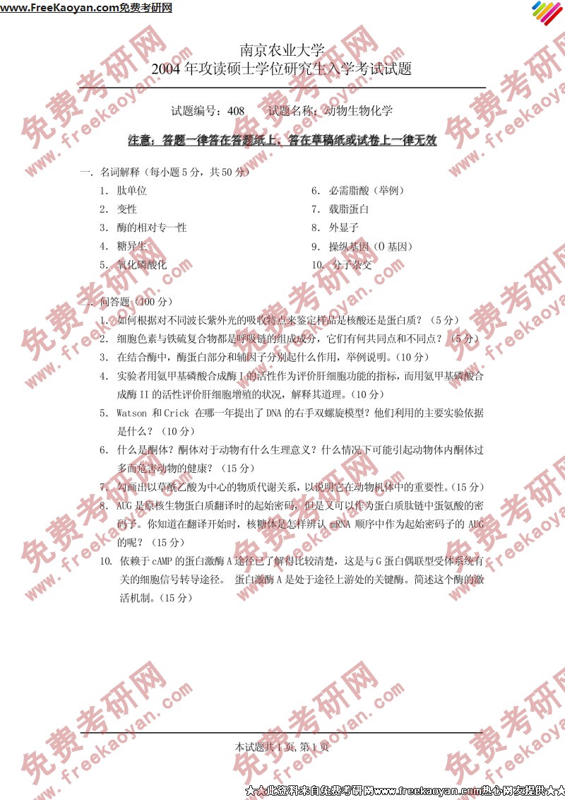 专业课考研经验 本站小编 FreeKaoyan 2018-01-23南京农业大学2004年考研真题-动物生理生化