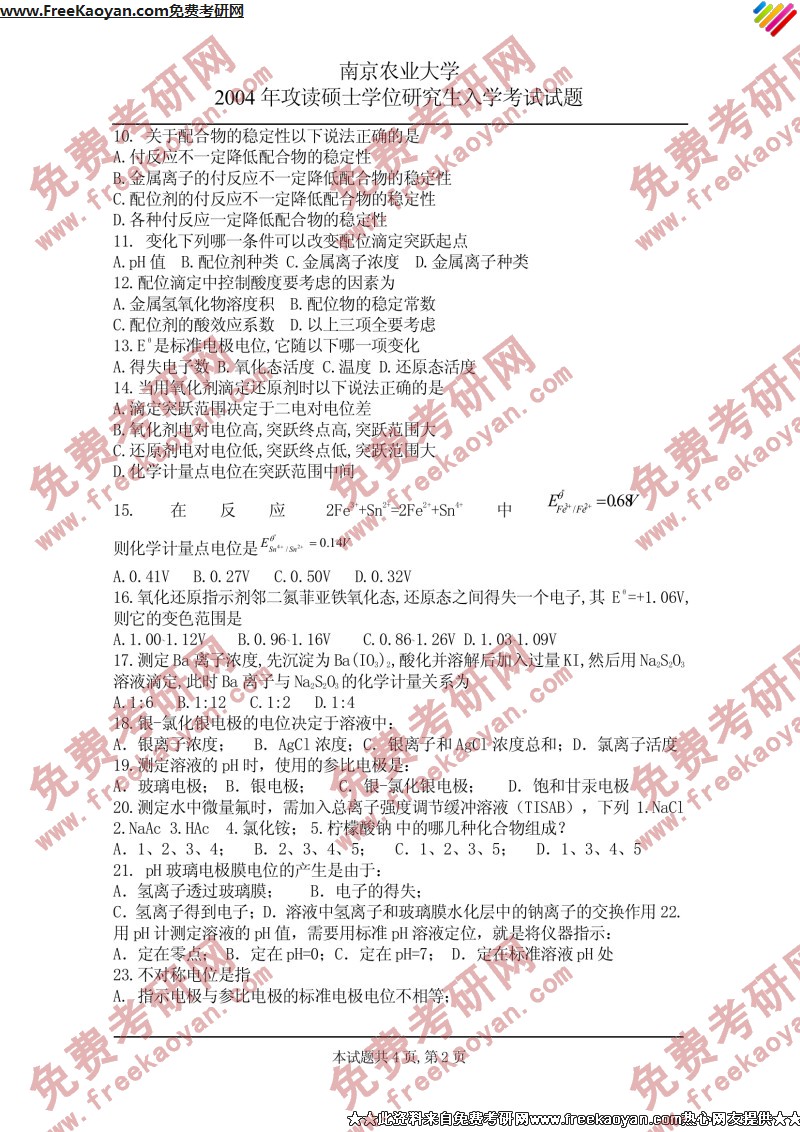 南京农业大学2004年考研真题-分析化学(2)